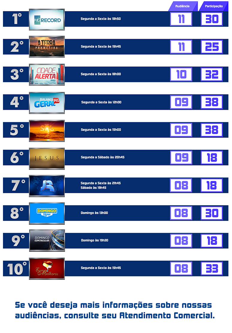 Confira aqui os ótimos índices de audiência conquistados pelos programas da RECORD TV em todo o país e saiba como aproveitar estes números para ampliar os resultados de sua comunicação! Nesta semana o primeiro lugar ficou com "MG Record”, seguido por "A Terra Prometida" e "Cidade Alerta Minas"!